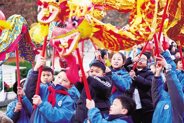 2月9日,在长沙市仰天湖桂花坪小学,小朋友在体验舞龙。