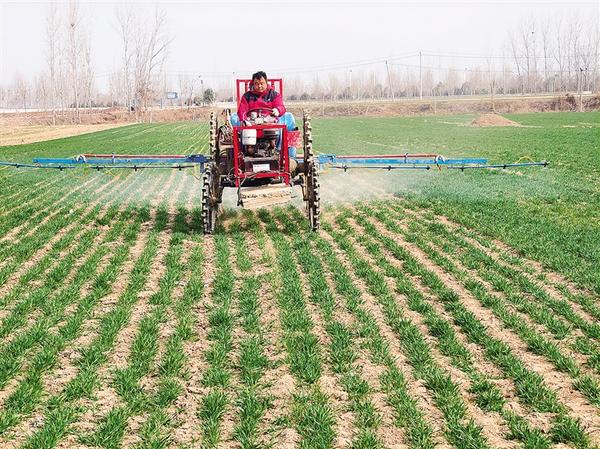 眼下正是春季田间管理的关键期。2月25日,在位于郸城县的周口市农科院科研基地麦田里,工作人员正驾驶农业机械喷洒除草剂。