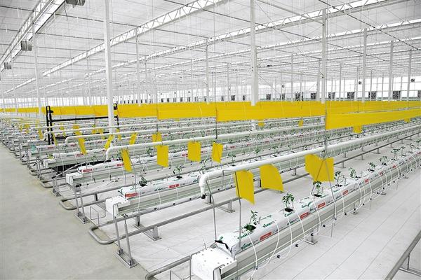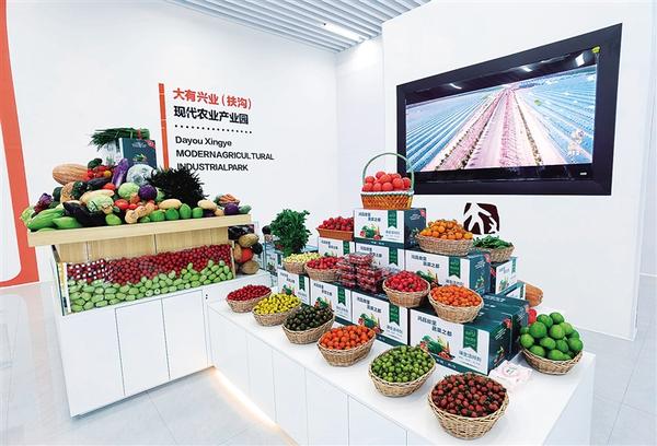 大有兴业(扶沟)现代农业产业园项目总投资 12.9亿元,建成后将成为集植物工厂、种苗研发中心、冷链物流集配中心、生物有机菌肥工程中心、数字党建与现代农业科技示范中心于一体的现代农业产业园。该产业园全面投产后年产值可达 4 亿元、新增就业岗位 1000 个。图①为温室内长势喜人的番茄苗。图②为产业园展厅内展示的农产品。记者 王映 摄