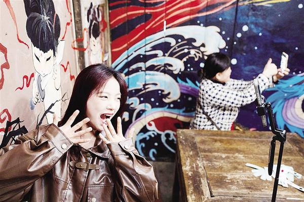 3月2日,在宜宾市泥溪镇坤隆昌茶馆,游客与墙上的哪吒壁画合影。