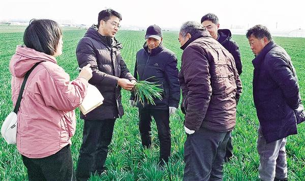 随着气温升高,我市1100多万亩小麦进入起身拔节期,各级农业技术人员送科技到田间,指导群众开展以“促弱、控旺、防冻、防倒、防病虫”为重点的春季麦田管理。图为近日,市农科院小麦专家在分析苗情,指导群众因地制宜,科学喷施水肥。 记者 付永奇 摄