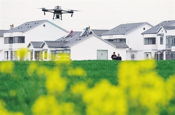 3月13日,在江苏省兴化市陈堡镇蒋庄村,农民操控植保无人机、自走式喷杆喷雾机实施杂草防治作业。