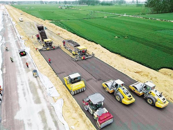 4月24日上午,工人们为329国道改建路段铺设第一层碎石路基。据了解,329国道改建路段全长5.879公里,西起商水县童岗村,折而向南又向东,至后赵寨村,呈直角形,为城市主干道,双向八车道。