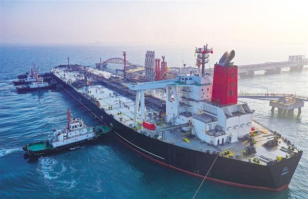 12月18日,一艘装载着17.9万吨石化原辅料的船舶泊入国投洋浦油储码头30万吨级原油泊位(无人机照片)。