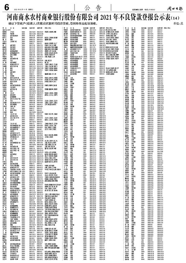 河南商水农村商业银行股份有限公司2021年不良贷款登报公示表(14)