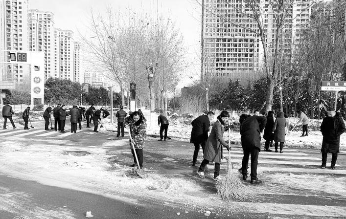 1月8日上午,周口市部分机关单位组织党员干部走上街头,清除人行道和慢车道上的冰雪,受到广大市民的称赞。