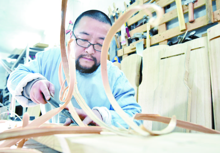 1月7日,王兵在古琴制作作坊里制作古琴。家住贵州省遵义市汇川区的王兵是一位古琴制作师,从10岁起便跟随外公学习古琴弹奏和制作技艺,至今已有30多年的古琴制作经验。“制作一张好琴,最久需耗时2年,有100多道工序,每个环节都要精雕细琢。”王兵说,“选料很关键,上漆很繁杂,调音最难掌控,既需要技术,更需要耐心。”作为遵义市非物质文化遗产(古琴制作)代表性传承人,王兵制作的古琴音色激越亮丽、空灵悠远,很受古琴爱好者喜欢,产品远销国内外。
