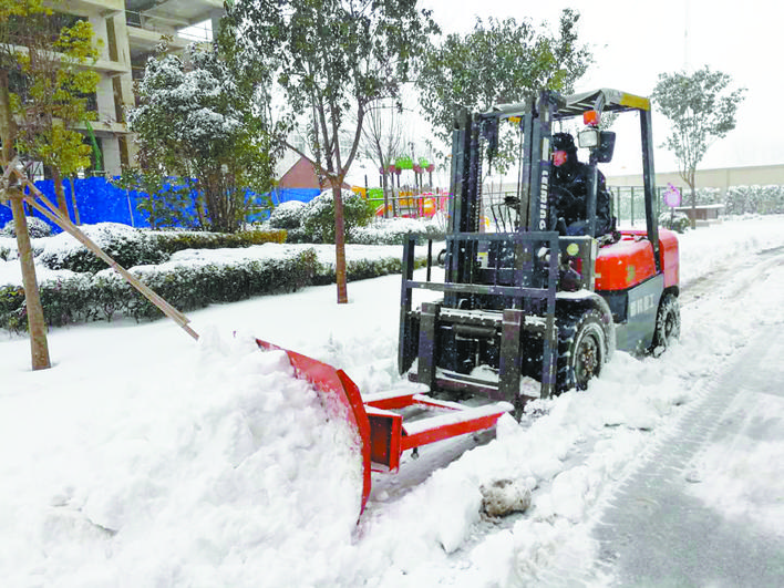 “因雪大天寒,道路上的积雪一夜成冰,单靠扫帚清理缓慢,影响业主出行。为提高工作效率,我们将上尊水厂的叉车和铲雪铲组合在一起,自制铲雪车,清理路面省时、省力,仅用两个小时就将整个小区路面清理干净,为小区业主快速排除了安全隐患。”晟德物业主管陈丹告诉记者。此外,晟德物业员工还在小区各入户门铺设了防滑垫,最大限度地防止行人滑倒,保障业主安全。
