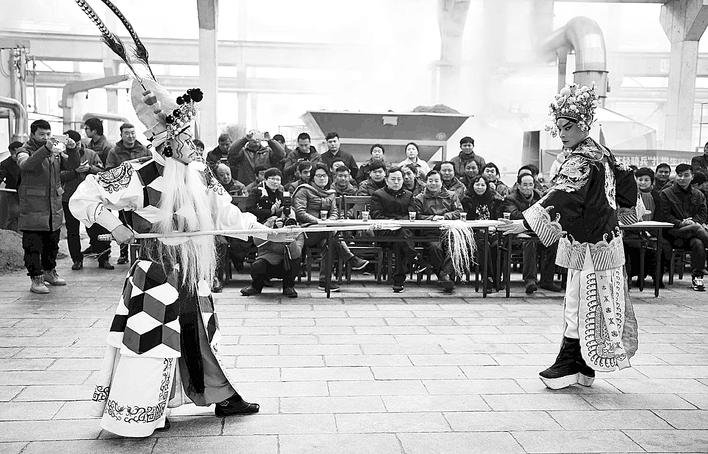 1月15日,在安徽亳州古井集团酿造车间,“文艺轻骑兵”戏剧小分队为酿酒工人演出传统优秀剧目。
