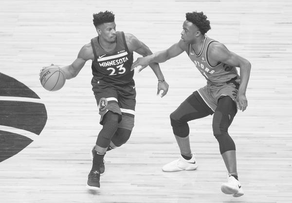 当日,森林狼队球员巴特勒(左)在比赛中进攻。