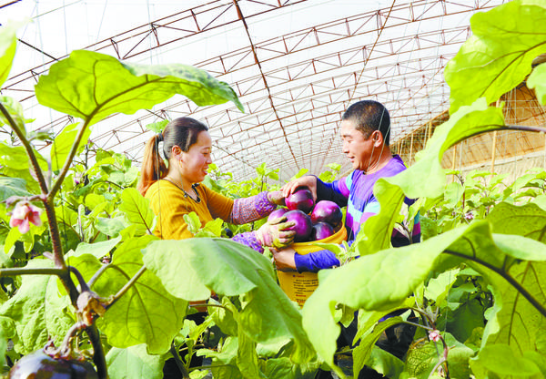 1月31日,河北省乐亭县古河乡佳丰果蔬专业合作社的社员在大棚内采摘茄子。