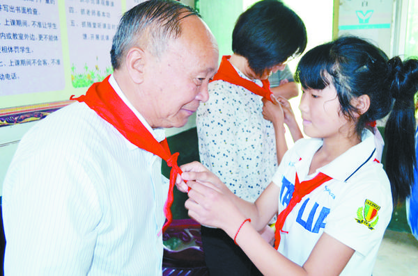留守儿童之家的留守儿童为张启良佩戴红领巾