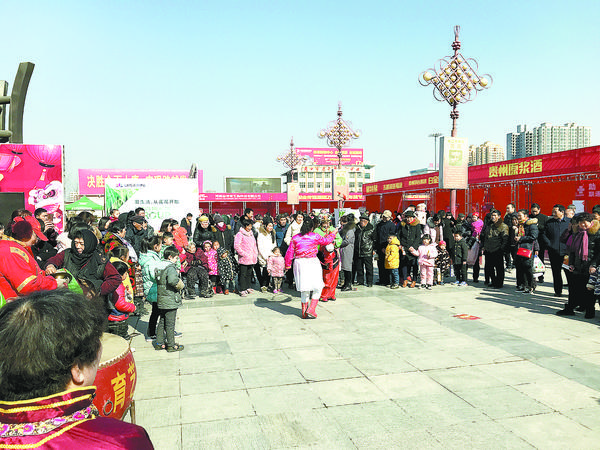 2月6日上午,市区五一文化广场张灯结彩,“驿见钟情”相亲会暨2018周口首届精品年货节让市民一站式置办年货。年货节现场的传统节目引得市民驻足观看(图五)。