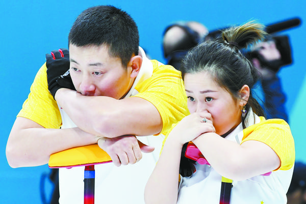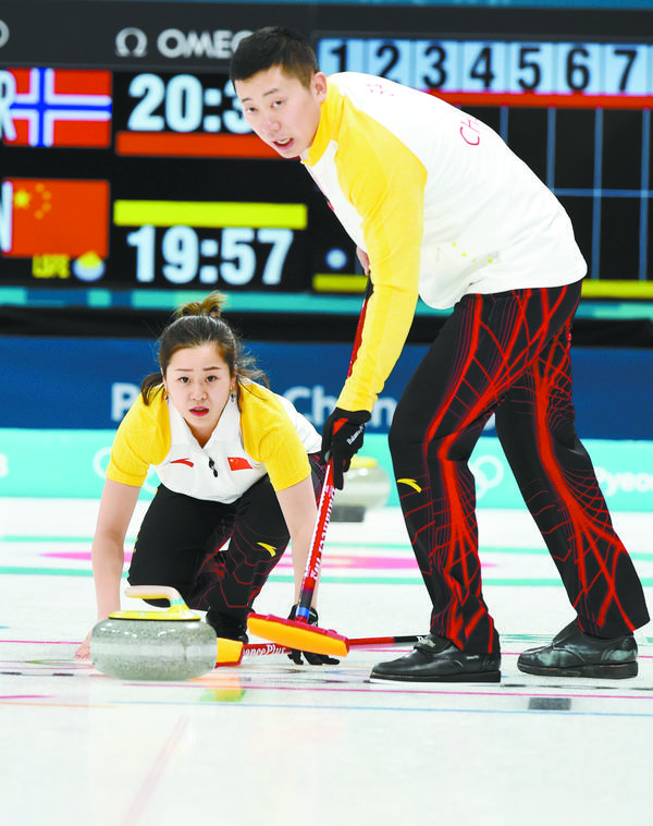 2月11日,在韩国江陵冰壶中心举行的2018年平昌冬奥会冰壶项目混双循环赛中,中国选手王芮和巴德鑫以9∶3战胜挪威选手克丽斯廷·斯卡斯利恩和马格努斯·内卓格滕。