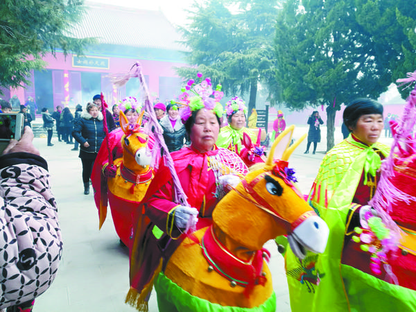 耿宝山所说的“历久弥新”很容易就在记者采访当天得到了证明:3支经挑舞队伍在女娲城里往来穿梭,不仅表演内容多样、富于创新,还都用上了现代化音响设备。除了经挑舞,女娲陵前还有竹马旱船表演、坠子书表演、经歌表演等,都与盘古女娲传说相关,引人入胜。