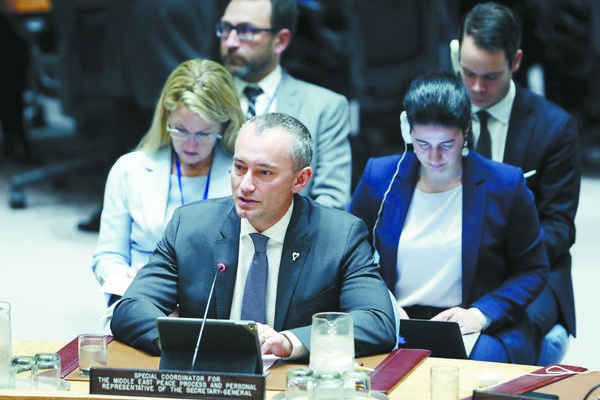 当地时间2月20日,在位于纽约的联合国总部,联合国中东和平进程特别协调员姆拉德诺夫(前)在安理会审议巴勒斯坦问题公开会上发言。