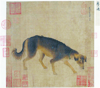 《猎犬图》现藏于北京故宫博物院,为南宋画家李迪所作,该图右上方署有“庆元丁巳岁李迪画”年名款,并钤有“都省书画之印”及清代收藏家耿昭忠鉴藏印多方,对幅有耿昭忠题记一则。《猎犬图》画面没有任何背景,只有一只猎犬前行,犬头犬尾低伏,颈上戴着项圈而无绳索,说明它非常有灵性。这只犬形态生动,造型准确,刻画细致入微,毛茸茸的细毛和脚爪清晰可见。色彩深浅搭配柔和,整体造型呈三角状,使整幅画刚柔相济,显示出作者深厚的写实功力和娴熟的表现能力。