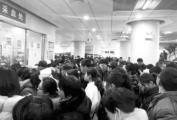 当日10时许,在市中心医院门诊大厅,前来就诊的患者和患者家属挤满了大厅(如图)。