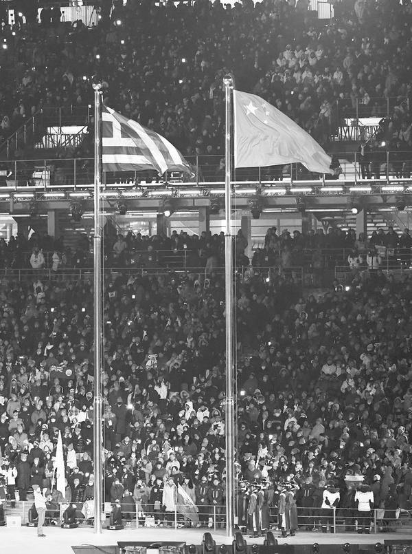 图为希腊国旗和中国国旗 在闭幕式上飘扬。