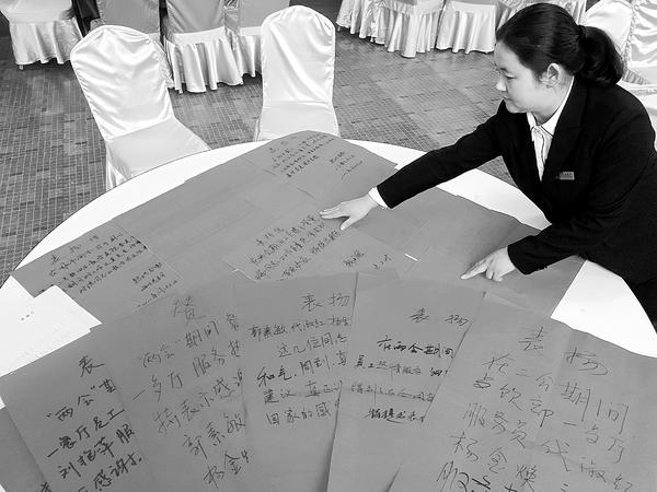 市四届人大三次会议、市政协四届二次会议期间,人大代表、政协委员驻地做好后勤保障,服务周到贴心,力保代表、委员全身心参会,为周口跨越发展建言献策,因此也赢得点赞连连。图为周口饭店收到的感谢信。记者 李伟 摄