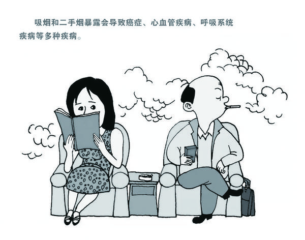 研究表明,二手烟对身体的危害比一手烟有过之而无不及。除肺癌,吸烟还易导致鼻咽癌、食道癌,以及肾癌和胃癌等,可谓“一支烟在手,周围人也遭殃”。