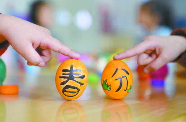 3月21日,河北省枣强县第一幼儿园的小朋友在玩“立蛋”游戏。当日是农历二十四节气中的春分,河北省枣强县第一幼儿园开展主题民俗活动,孩子们体验春分绘彩蛋、立蛋等习俗,迎接春天的到来。新华社记者 朱旭东 摄