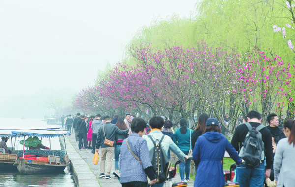3月26日,游客在西湖白堤上游览。随着气温升高,杭州西湖白堤上桃花渐次开放,呈现出经典的“一桃一柳”美景,吸引大批市民和游客前来踏青赏花。