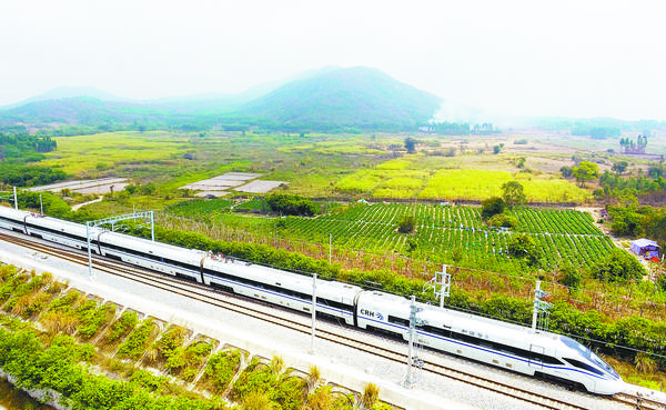 列车在环岛高铁西段棋子湾站附近行驶(3月6日摄)。
