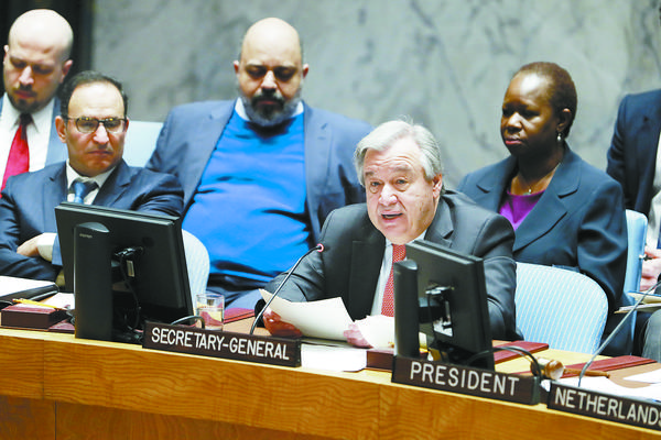 当地时间3月28日,在位于纽约的联合国总部,联合国秘书长古特雷斯(前右)在安理会关于联合国维和行动的高级别辩论会上发言。联合国秘书长古特雷斯28日表示,联合国维和行动正面临严峻挑战,必须采取强有力的集体行动使得维和行动更加强大和安全。新华社记者 李木子 摄