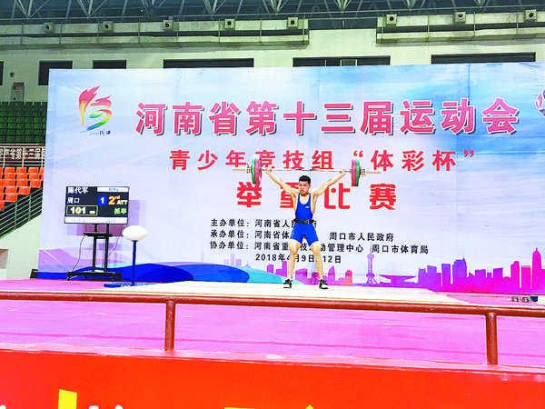 4月10日晚上,周口选手陈代军在省十三运会男子举重62公斤级甲组比赛中发挥出色,以231公斤的总成绩夺冠。记者 王凯 摄