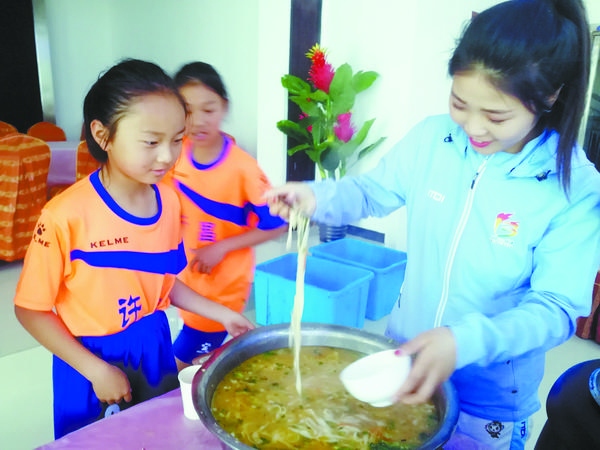 “由于运动员运动强度大,出汗比较多,我们要提醒宾馆服务员给他们及时更换床单、被罩。在运动员就餐时,我们会递送餐盘,并帮助小运动员盛热汤、面条。”段慧靓说。