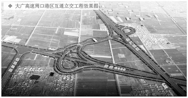 为了实现周口中心港与全国高速公路网无缝对接,总投资约2.43亿元、连接南北交通要道“五进十出”的大广高速周口港区互通立交项目,已进入建设阶段,根据计划,2018年年底前确保完成总工程量的60%。项目完工后可使329国道及周边车辆与大广高速实现快速转换,与区域内其他高速公路、国道、省道连接成网,形成区域内较为完善、高效的高等级公路运输体系,有助于发挥区域路网的整体效益,同时减少港区市政道路交通量,方便居民出行。