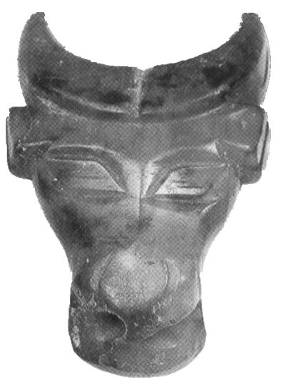 绿玉牛面形佩。灰绿色,有白色沁点,微透明。系高浮雕,正面雕出牛首形状,角短粗,角尖上翘,角下置小叶形耳,阴线刻出菱形目,突鼻梁,厚嘴唇,口部斜钻一小孔,为双面钻,角下部刻弧形阴线,将角与耳、额分开,背面光素。高3.6厘米,宽3.5厘米,厚0.8厘米。(未完待续)