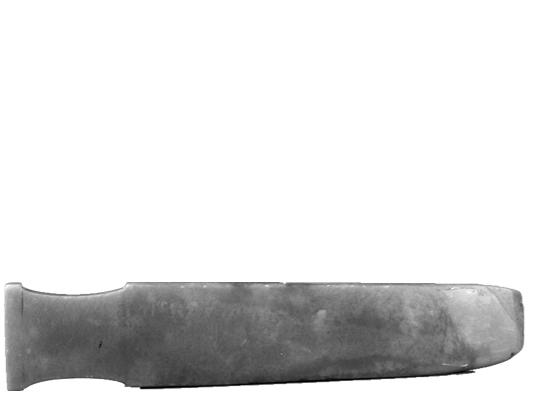 黄玉长援直内戈。通长47.1厘米,援宽8.3厘米,内上边长9.4厘米,下边长8.9厘米,宽8.3厘米,内厚0.4厘米,穿孔径分别为1.1厘米和0.6厘米。绿黄色,有根须状褐沁,微透明,通体抛光。扁平体,长条三角形援,援宽接近援长的四分之一,前锋尖锐,有“川”字形中脊和侧直抵内部,两边磨刃,刃部锋利,援内分界明显,长方形直内。内中部有单面钻圆穿孔两个,一大一小。此戈体大质精,完好无损,无使用痕迹。