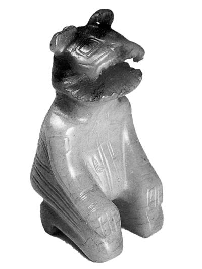 黄玉虎形跽坐人。绿黄色,顶部有褐斑,顶端微沁,微透明,圆雕。从正面看为一虎首跽坐人,从背面看为 一鸮。虎首高昂,大口暴张,牙齿清晰,上下各七齿,上边齿呈倒钩状,小鼻,双鼻孔,长圆形双目,虎视眈眈,半圆形双耳,虎头以下为人身形状,体向前倾,跽坐,双手扶膝,五指向下,未露足趾似着鞋,身着衣。鸮呈蹲状,虎之双耳为鸮耳,耳后倾,大钩鼻,圆目突睛,鼻下一圆孔。人背作鸮身,人之胳膊作双翼,人之双足作鸮足,昂首挺胸,怒视前方。高5厘米,宽2.5厘米,厚2.8厘米。作器者将虎头、人身、立鸮巧妙地表现在一件不大的器物上,可谓匠心独具,巧夺天工。通体饰云饰,纹饰大多用双线阴刻,仅个别部位如双臂纹饰用单线阴刻,生动传神,是长子口墓出土玉器中为数不多的圆雕作品。鼻下有圆孔,显系佩带之物。商周圆雕玉人发现较少,殷墟妇好墓出土了3件,其中1件为石质。较之于长子口墓这件虎首跽坐人,相同点是跽坐,身前倾,胸背纹样基本相同,显示了共同的时代特征。而将人、虎和凶禽完美集于一体的圆雕玉器则为首次发现。这对研究商周玉器有极其重要的价值。
