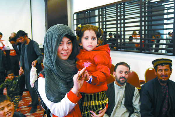 当地时间4月17日,在阿富汗首都喀布尔,中国红十字援外医疗队成员在记者会后与患儿合影。中国红十字援外医疗队17日在阿富汗首都喀布尔表示,根据“天使之旅——‘一带一路’大病患儿人道救助计划”,第二批阿富汗25名先天性心脏病患儿将赴华接受治疗。