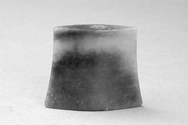 战国青玉珌。1983年,淮阳县公安局从大连乡一盗墓群众家中查获,后移交县文管所收藏。1985年,县文管所撤销,后移交县博物馆收藏。该器物通高4.6厘米,宽5.3厘米,厚1.45厘米。平面呈梯形,侧面呈两瓦相覆状,通体素面磨光,其内侧中部有一圆孔。