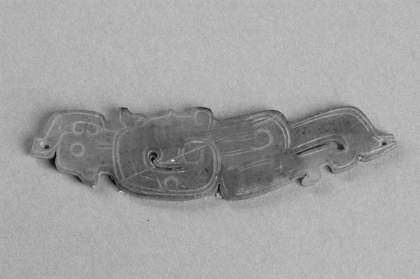 战国镂雕龙形青玉佩。1983年,淮阳县公安局从大连乡盗墓群众家中查获,后移交县文管所,1985年县文管所撤销,移交县博物馆收藏。该器物通长9.8厘米,宽4.4厘米,厚0.2厘米。体呈平板状,昂首,躬身,翘尾,透雕龙体,后身呈折叠状,龙身饰卷云纹,青玉质地。