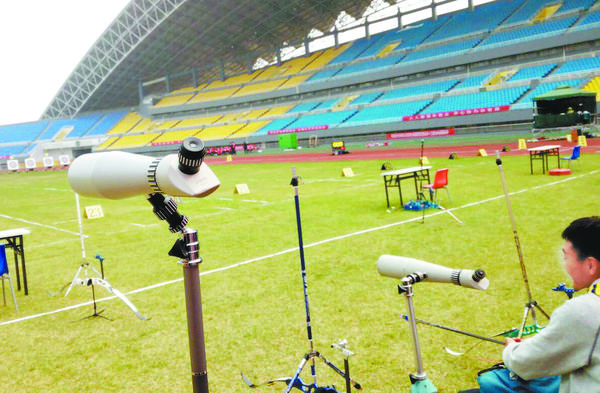 记者在比赛现场最先注意到的是一个个类似于“子弹壳”的观靶镜,它们被放在三角架上,选手每射出一箭,教练或者队友就通过这些观靶镜进行观察,然后把中靶环数及时反馈给选手,以使选手调整到最佳射箭状态。
