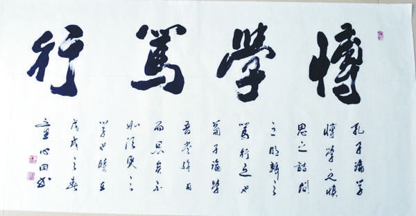童式书法,大胆创新,重韵尚法,阴阳和谐。在章法上,谋篇布局,计白当黑,疏朗有致,聚散舒适,规范得体,大小错落,浓淡相宜;在笔法上,奇正结合,中锋用笔,刚柔相济,提按娴熟,使转自然,笔意潇洒,点如坠石,横如阵云,折勾如戟,或“锥划沙”,或“屋漏痕”,或“折钗股”;在墨法上,干湿自然,浓淡结合。