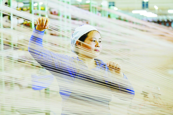 5月1日,江苏省泰州市一化纤公司纺织工人在生产一线作业。当日是“五一”国际劳动节,众多劳动者在劳动中度过节日。