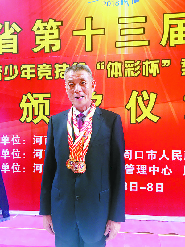 5月3日,在省十三运会青少年竞技组柔道比赛中,周口柔道队教练崔仲保麾下的4名弟子获得3金1铜的好成绩。崔仲保3次登上领奖台与弟子们一起享受胜利的喜悦。图为崔仲保在领奖台上。