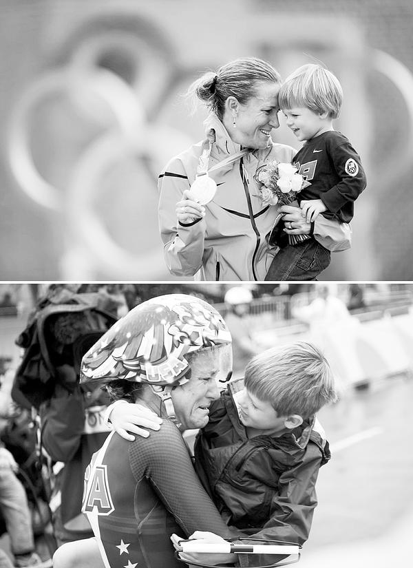 图3为2016年8月10日,美国选手克丽斯廷·阿姆斯特朗与儿子一起在里约奥运会女子公路自行车个人计时赛夺冠后和儿子拥抱。新华社 发