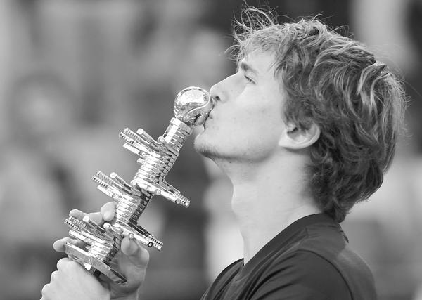 图为德国选手亚历山大·兹维列夫在颁奖仪式上亲吻奖杯。