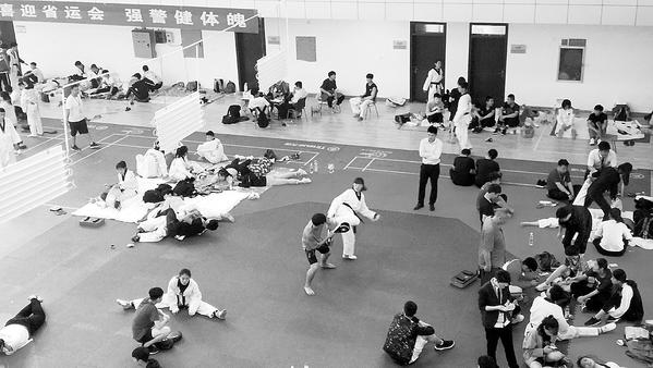 5月16日,在省十三运会青少年竞技组跆拳道项目的运动员休息区,参赛运动员趁着比赛间隙,进行赛前训练。记者 牛思光 摄
