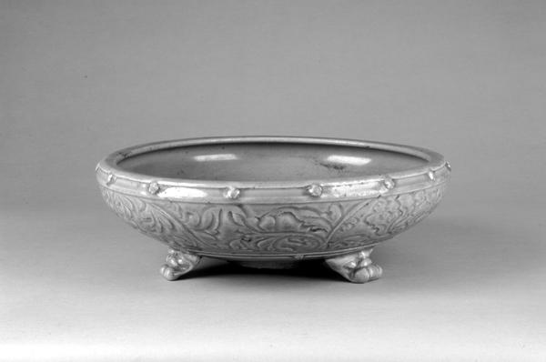 明龙泉窑“金玉满堂”刻花三足洗,1983年在淮阳出土,1984年公安部门在盗墓群众家中查获,后移交文物部门,现藏于周口市博物馆。该器物通高10.5厘米,口径27.6厘米。敛口折肩,圆唇平沿,斜腹微弧鼓。腹下附三兽面足,多侈、底部假圈足内凹。肩负施凸弦纹一周,沿、肩之间附16朵梅花。腹刻折枝牡丹花卉,腹下施两道凸旋纹,两旋纹之间附6朵梅花。豆青天釉不过底,内砂底,有十字形、间有“金玉满堂”四字。