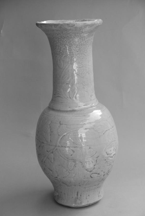 元龙泉窑印花瓶,该器物高56.3厘米,口径20.05厘米,足径17.5厘米。商水县文物管理所旧藏,应是在墓葬中出土,现藏于周口市博物馆。该器物圆唇,敞口,长颈,弧肩,鼓腹,胫部稍外侈,矮圈足,胎体厚重,胎质坚致,胎呈红褐色,器身施满青釉,釉面有细小开片,釉不裹足,器颈部和腹部模印缠枝牡丹花卉,胫部印一周蕉叶纹。