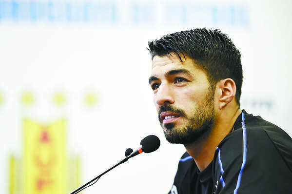 5月28日,乌拉圭国家男子足球队在卡内洛内斯集训,备战2018俄罗斯世界杯足球赛。 下图为乌拉圭队球员苏亚雷斯在训练后的发布会上。 新华社 发
