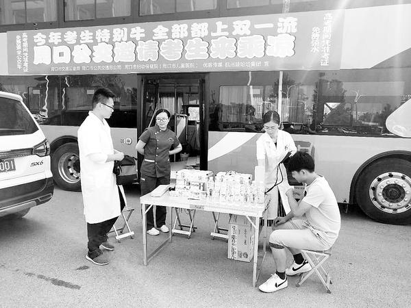 此外,市公交总公司还联合市儿童医院和爱心企业,为考生准备了饮用水、风油精等防暑物品。市儿童医院的数名医护人员在现场待命,随时为考生和陪考家长提供医疗服务。