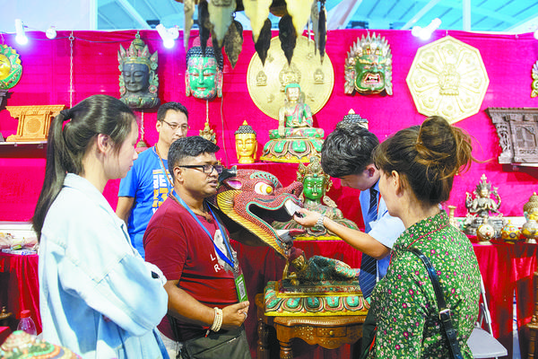 来自尼泊尔的客商(左三)在第5届中国-南亚博览会上出售特色手工艺品(6月18日摄)。6月14日至20日,第5届中国-南亚博览会暨第25届中国昆明进出口商品交易会在云南昆明举行。本届展会前4天吸引45万人次前来观展。